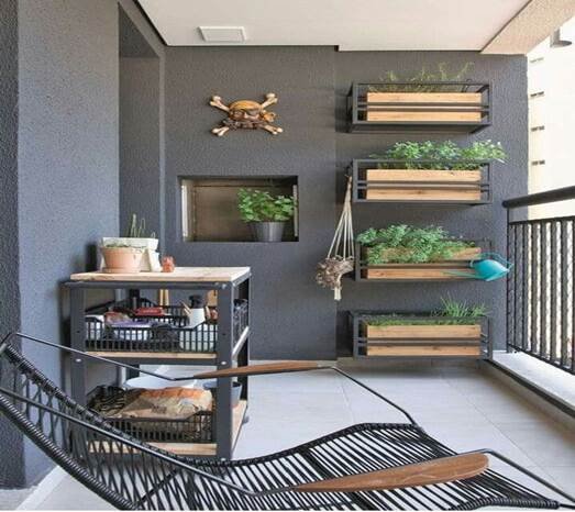 Pois a proposta moderna preza por praticidade, tudo precisa ter um propósito. Existem diversas opções de móveis planejados e dobráveis que se encaixam perfeitamente em varandas pequenas ou integradas à sala.